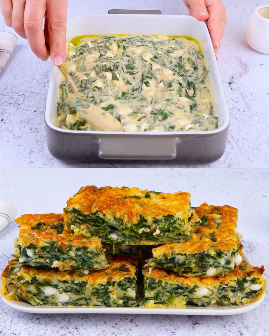 C’est un plat cuit au four à base d’épinards, d’œufs et de fromage, jusqu’à ce qu’il soit ferme. On peut le préparer dans un seul plat et le découper en carrés, ou dans des moules individuels.